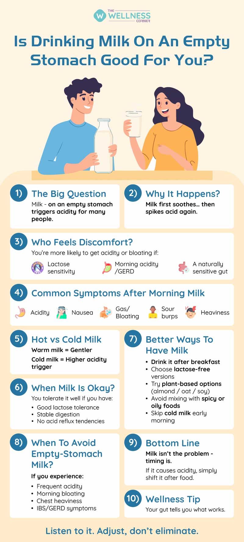 This rebound effect can cause discomfort, bloating, or acidity later in the morning. If you have a sensitive gut, GERD, or a tendency to feel gassy, drinking milk on an empty stomach can worsen symptoms rather than fix them.